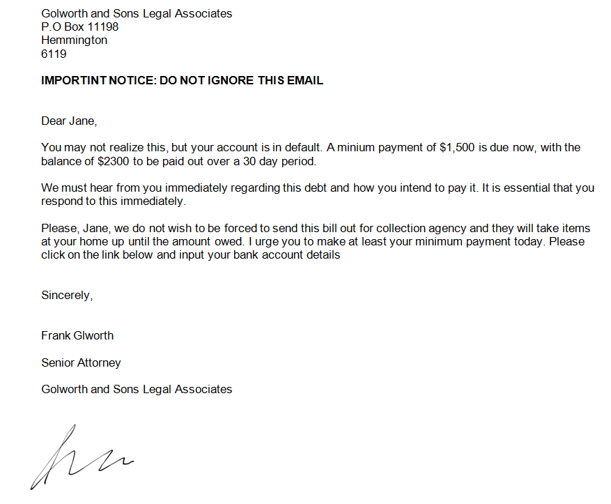 Reading (131 -140) Show session ID Load QuizSave Quiz Welcome to the OLNA Support Reading Skill Builder Each question will be multiple choice There will be four answers to select from If you can’t figure out the answer, you should use the “Hint” as a guide to work out the correct response. Click next once you have selected your answer to take the next question Question 131.The following question relates to the photo above of an airline terminal sign.Question. If you had to go to the “Otobus otoparki” to catch your flight, where would you need to go?Hint Hint: find the words in the question on the sign and look for its translation to the taxi rank this answer is incorrect because tax is are not mentioned on the sign to the bus park this answer is correct because on the sign under “Octobus otoparki” it says “Bus park” to the domestic terminal this answer is incorrect because “Octobus otoparki” does not refer to the domestic terminal to the carpark this answer is incorrect because “Octobus otoparki” does not refer to the carpark None Question 132. The image above is of an email that Jane received from a lawyer. Question. What is the writer hoping to achieve? Hint Hint: think about the reasons why someone would write this email and what they are hoping to get from the reader. to help Jane avoid legal action this answer is incorrect because the email is trying to hold her accountable for a legal wrong doing to deceive people into paying money this answer is correct because the email has been designed to convince people to pay money for no reason to protect the bank who owned the account from Jane who defaulted this answer is incorrect because the letter has nothing to do with a bank to get the full amount of $2300 from Jane who defaulted this answer is incorrect because there is no clear details about what Jane has done wrong None Question 133. The image above is of an email that Jane received from a lawyer. Question. Which aspect of the above letter suggests it could be a scam? Hint Hint: read the answers below and think about the obvious signs that you would pay attention to if you were worried this letter may be fake it includes several spelling mistakes this answer is correct because there are several spelling and grammatical errors that are unlikely to be in a legitimate legal document it doesn’t make sense this answer is incorrect because the sentences themselves make sense even though there are errors in the document it is from a lawyer this answer is incorrect because lawyers often send letters for similar legal reasons the signature doesn’t look real this answer is incorrect because signatures can vary and it is very difficult to determine whether they are legitimate None Question 134.The image above is of an email that Jane received from a lawyer.Question. Which of the following phrases is designed to put pressure on Jane to pay the amounts detailed in the letter?Hint Hint: Read each of the phrases in the answers below and look for words that make the sentence sound urgent please click on the link this answer is incorrect because it is a request and doesn’t entail pressure you may not realize this this answer is incorrect because it doesn’t entail pressure it is essential that you this answer is correct because “essential” has been used to make the message sound more urgent how you intend to pay it this answer is incorrect because it doesn’t entail pressure None Question 135. The image above is of an email that Jane received from a lawyer. Question. What makes this letter appear believable? Hint Hint: think about how this text has been put together to look as believable as possible it has the words “do not ignore this email” this answer is incorrect because many letters include this phrase to create impact and formality it uses emotional language this is incorrect because generally lawyers would not use emotional language in a formal letter it uses a formal layout and legal words this answer is correct because the layout and legal terms have it is very detailed this answer is incorrect because this email is very short on details about why Jane owes money None Question 136. The following question relates to the above image of a menu. Question. What do the numbers on the right hand side represent? HintHint: Think about why you would look at the menu and what kinds of questions you may have about the items on it the quantity of the items this answer is incorrect because the information under the image says it is a menu and therefore the numbers have to be prices the rarity of the items this answer is incorrect because the information under the image says it is a menu and therefore the numbers have to be prices the price of the menu items this answer is correct because the information under the image says it is a menu and therefore the numbers have to be prices the product code this answer is incorrect because the information under the image says it is a menu and therefore the numbers have to be prices None Question 137. The following question relates to the above image of an inventory of movie DVDs. Question. In what way are the movies organised? Hint Hint: look carefully at the way in which the movies are organised and then compare this way with each of the answers listed below The movies are organised randomly this answer is incorrect because there is an ordered structure The movies are organised alphabetically this answer is correct because the movie list is in alphabetical order The movies are organised based on their genre category (e.g. Drama, Romance) this answer is incorrect because there is a different way they have been organised which is not based on their genre category The movies are organised based on their ratings this answer is incorrect because there are no indications of ratings in the movie index None Question 138. The above was a web post that was passed around universities during the holiday season. Question. What is the 