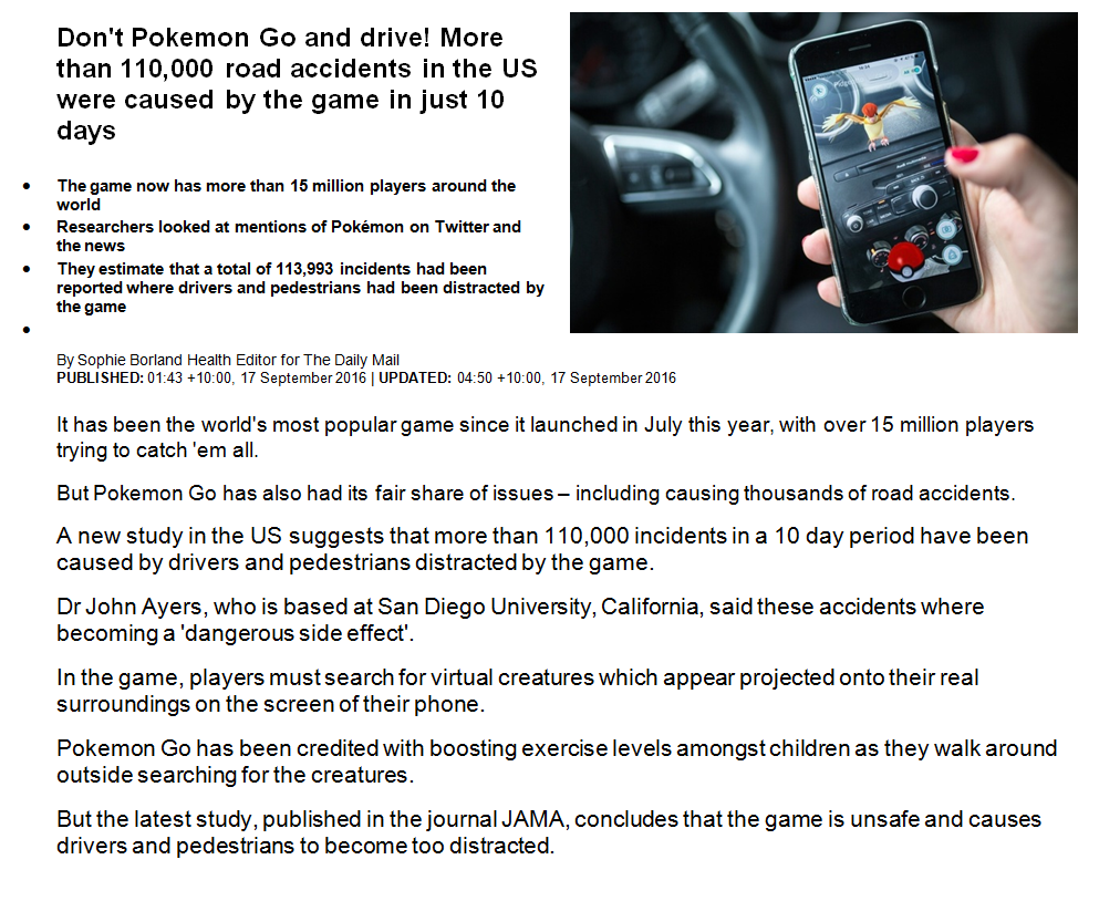 Reading (111 – 120) Show session ID Load QuizSave Quiz Welcome to the OLNA Support Reading Skill Builder Each question will be multiple choice There will be four answers to select from If you can’t figure out the answer, you should use the “Hint” as a guide to work out the correct response. Click next once you have selected your answer to take the next question Question 111. The following question relates to the image above of a computer screen. Question. How would the user, Adam Carter, access information he has stored in the cloud? HintHint: scan through the image looking for pictures that represent icons that could be used to open the program required He would click on his desktop this answer is incorrect because it would not provide direct access to his cloud storage system He would check his reading search this answer is incorrect because the reading list would not help him access information in the cloud He would click on “SkyDrive” this answer is correct because the icon for SkyDrive is a cloud which shows you it refers to a cloud storage system He would click on “Internet Explorer” and then “Google it” this answer is incorrect because he does not need to search for it on Google; he can simply click an icon on his screen to access it None Question 112. The following question relates to the image above of an edited article written by Sophie Borland. Question. Which of the following sentences has an error in it? HintHint: ignore the text and read through the answers provided and look at each word(s) for errors Dr John Ayers, who is based at San Diego University, California, said these accidents where becoming a 'dangerous side effect'. this answer is correct because the “where” should be “were” But the latest study, published in the journal JAMA, concludes that the game is unsafe and causes drivers and pedestrians to become too distracted. this answer is incorrect because there are no errors in this sentence A new study in the US suggests that more than 110,000 incidents in a 10 day period have been caused by drivers and pedestrians distracted by the game. this answer is incorrect because there are no errors in this sentence Pokémon Go has been credited with boosting exercise levels amongst children as they walk around outside searching for the creatures. this answer is incorrect because there are no errors in this sentence None Question 113. The following question relates to the image above of an edited article written by Sophie Borland. Question. Why have dot points been included in this article? HintHint: consider why it is an advantage having dot points in a text which includes a lot of information to make it look more interesting in a newspaper this answer is incorrect because the article is an online article and not found in a newspaper to save readers time by summarising the main points this answer is correct because dot points provide fast and accessible information because all of these are links to other websites that readers can click to access this answer is incorrect because none of these dot points appear in blue to indicate they are links it was an accident as they should have been included in the story this answer is incorrect because the dot points have been deliberately used None Question 114. The following question relates to the image above of an edited article written by Sophie Borland. Question. What is the main purpose of the above article? HintHint: reread the first and last sentence as well as the dot points provided then consider what the main message of the text would be to show that Pokémon Go is popular this answer is incorrect because the popularity of the game is not the main purpose of the article to show that Pokémon Go is played by over 15 million people so people want to read about its problems this answer is incorrect because the popularity of the game is not the main purpose of the article to show that games are addictive and something needs to be done to ban them this answer is incorrect because there is no argument about addiction mentioned in the article to show how a recent game has caused many social problems which could not be predicted this answer is correct because the article focuses on various concerns that have become an issue since the release of the game None Question 115. The following question relates to the image above of an edited article written by Sophie Borland. Question. What does Dr John Ayers have to say about Pokémon Go? HintHint: scan the article looking for the name John Ayers and read his quote and look through the options in the answers provided to find the closest fit that Pokémon Go was created to cause accidents this answer is incorrect because the game is not “directly” the cause of the accidents; people failing to pay attention to their surroundings is the primary cause of the accidents parents should monitor how much their children access the game this answer is incorrect because Dr Ayers does not comment about parents or children that Pokémon Go was designed to be so interesting that people could not look away from it this answer is incorrect because Dr Ayers does not say the game is too interesting that Pokémon Go has an unintended effect on people which can put them at risk this answer is correct because Dr Ayer states that the game can have a “dangerous side effect” which means it was not intended None Question 116. The following question refers to the image above. Question. How has the image above been created to appeal to children? HintHint: consider how children find texts interesting and look for the most complete answer out of the options provided its layout is simple to allow children to follow it easily this answer is incorrect because even though the layout is simple, it is very similar to other instructions for adults and therefore not specific to children it uses cute pictures, bright colours and simple text this answer is correct because the pictures and co